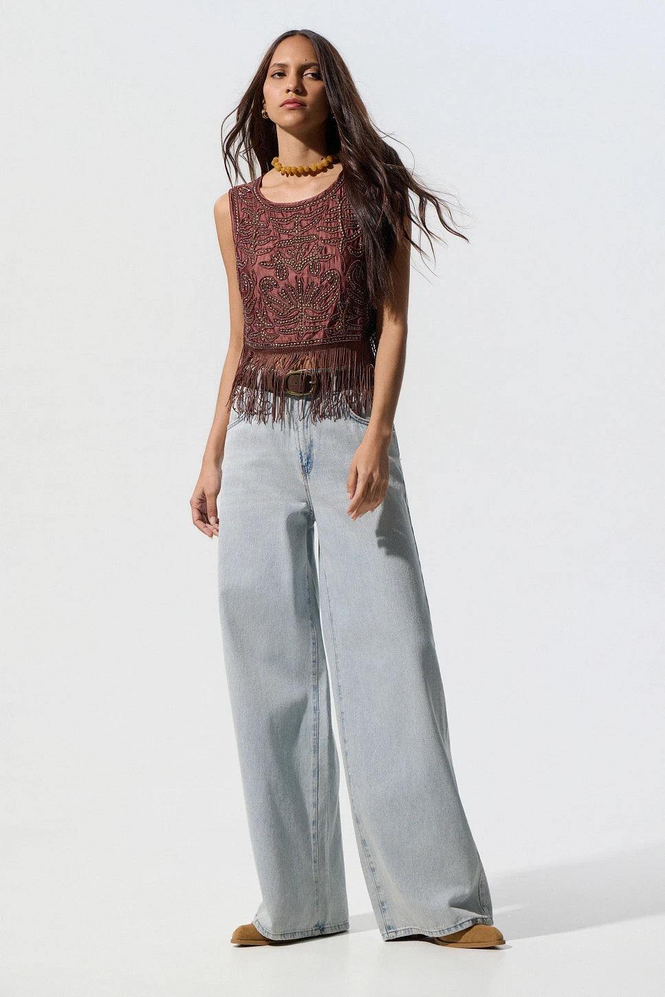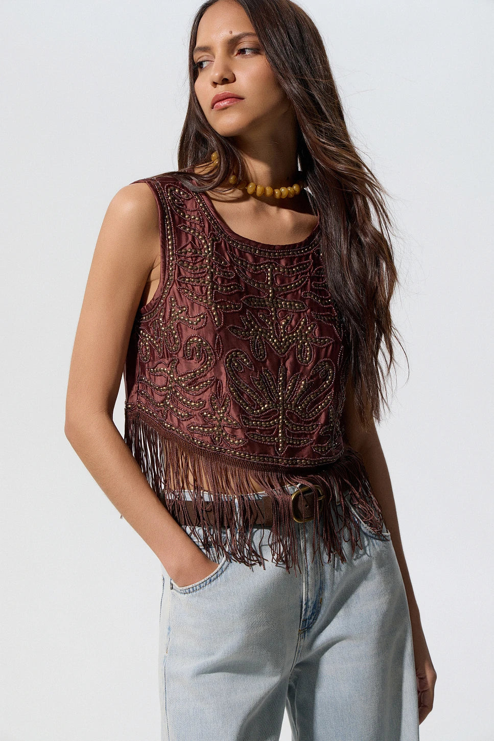 TOP CORTO SIN MANGAS CON FLECOS CHOCOLATE
