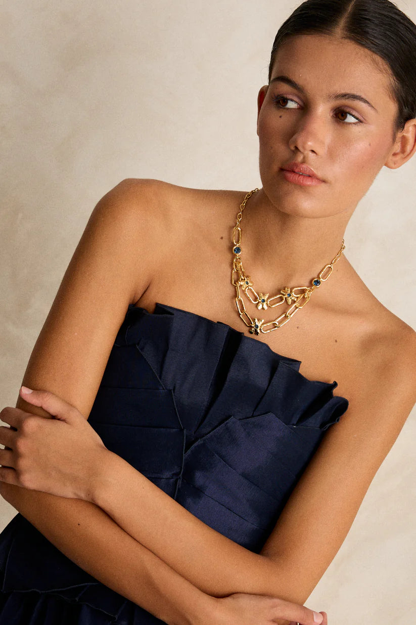 Su diseño entrelaza eslabones dorados con cruces de inspiración orgánica, trabajadas con un efecto martelé que resalta cada detalle. En el centro de cada cruz, un cristal checo de intenso azul zafiro aporta profundidad y sofisticación al conjunto.