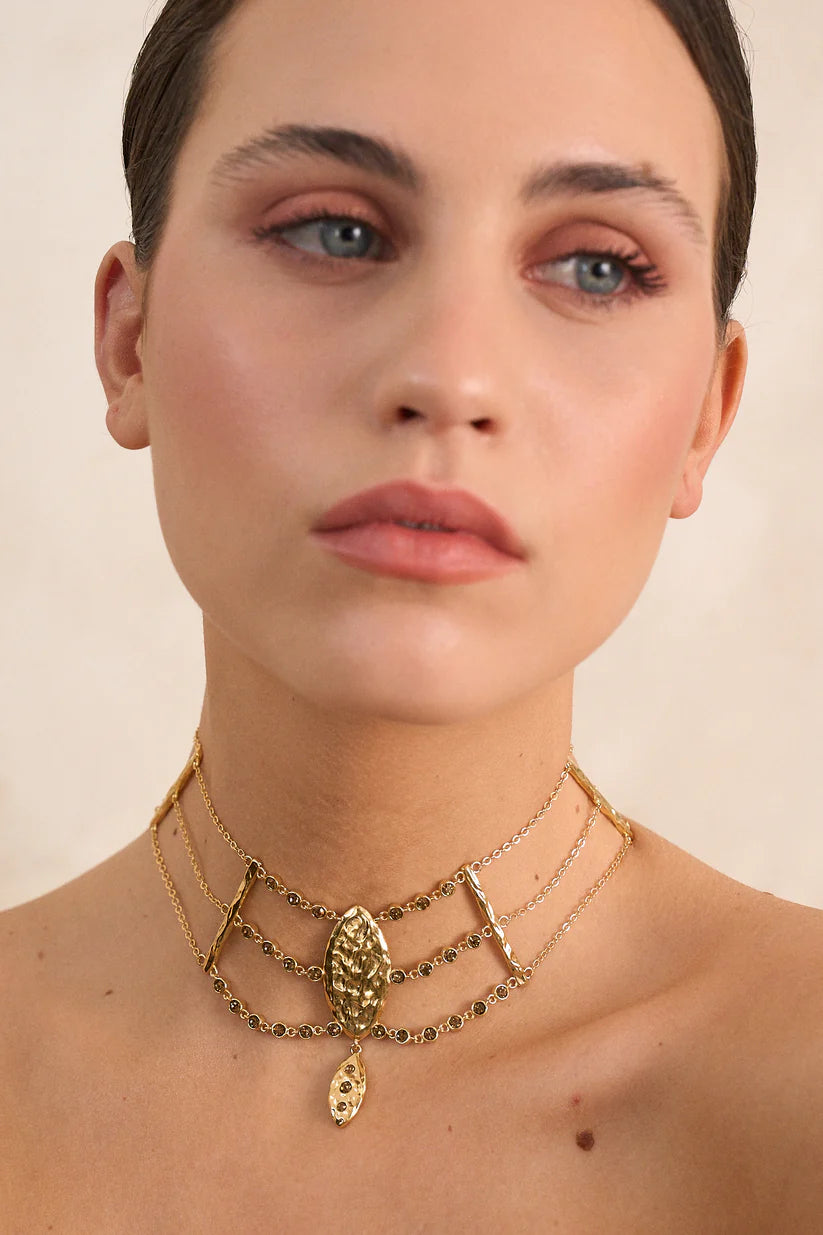 Su diseño ajustado al cuello realza la feminidad y el porte, evocando las joyas ceremoniales que simbolizaban poder y belleza en la antigua Mesopotamia.