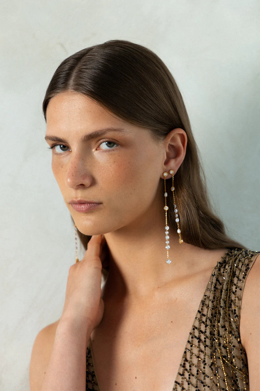Los Pendientes Cova destacan por su diseño asimétrico y delicado que juega con la luz y el movimiento. Están compuestos por finas cadenas bañadas en Oro de 18k, decoradas con circonitas blancas de distintos tamaños y formas, combinadas con pequeñas perlas naturales.
