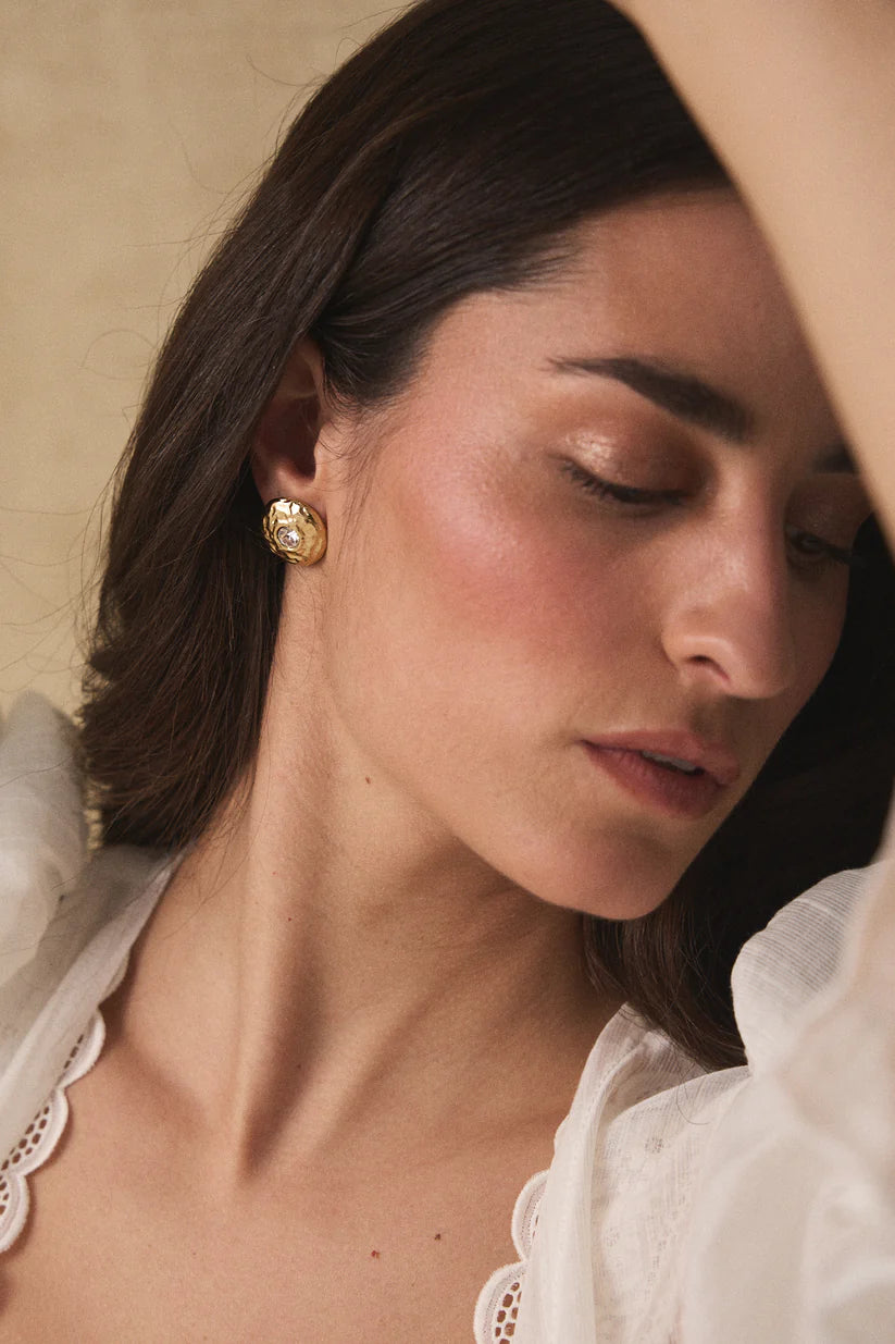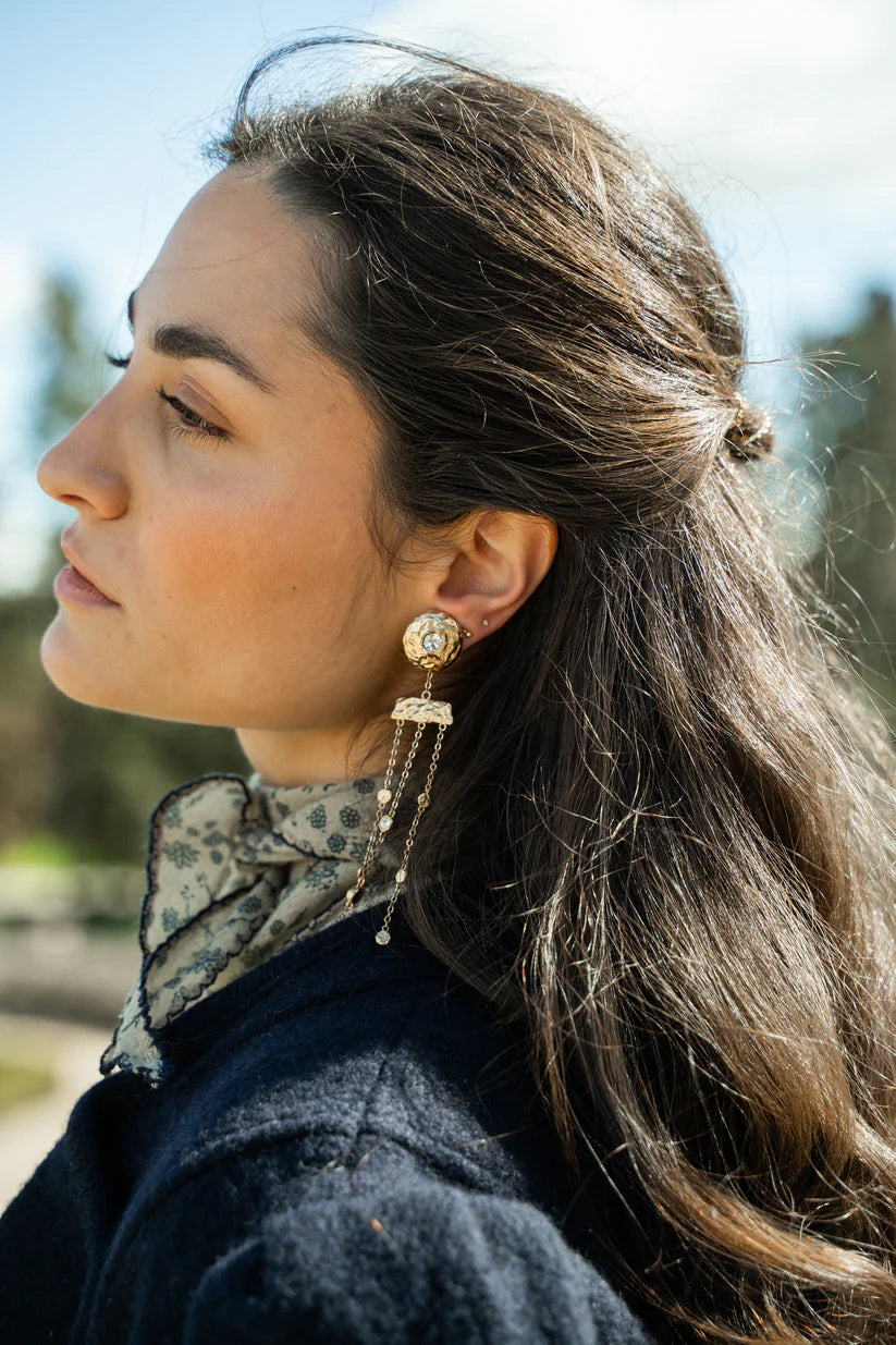 La pieza más especial de la colección, su composición captura el romanticismo nostálgico de LE CHÂTEAU. Un pendiente de botón que concentra toda la luz en su centro y, que por sí mismo, destaca con elegancia.