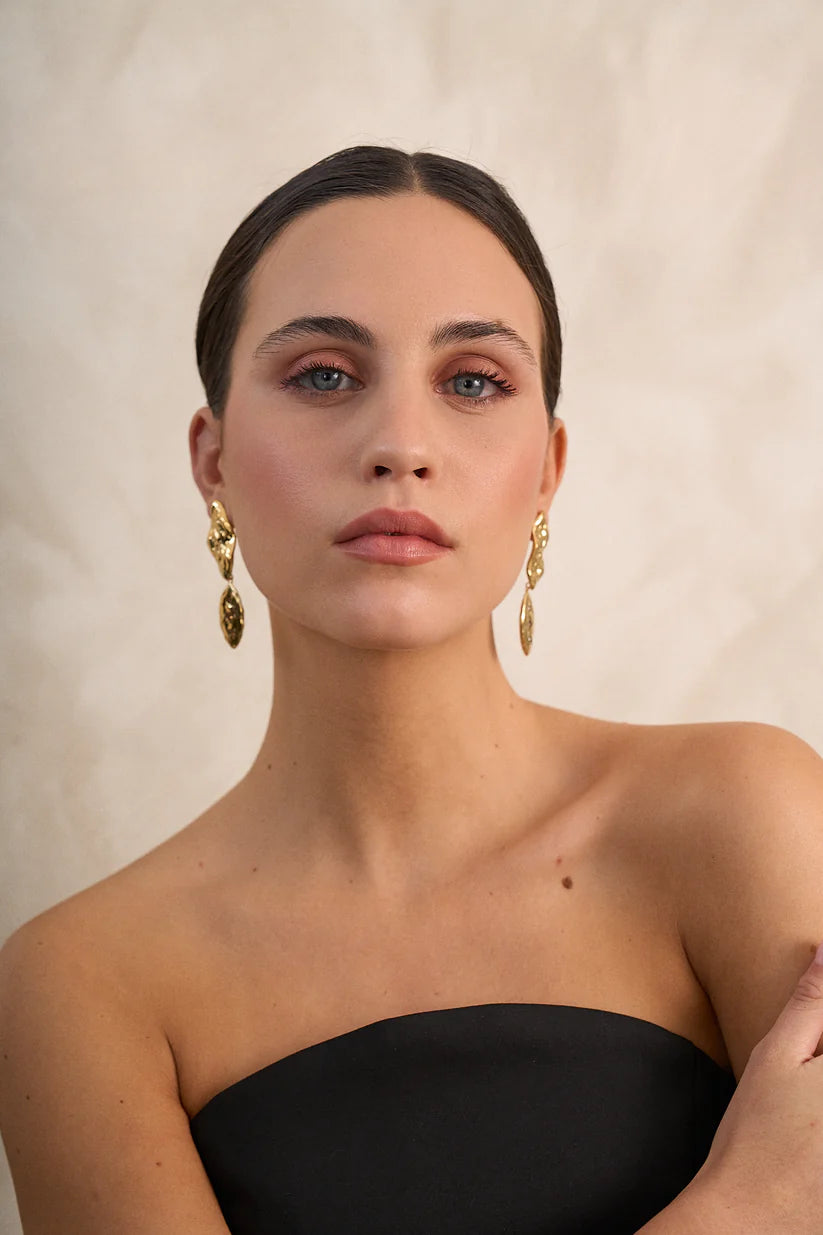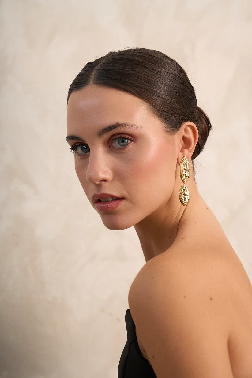 Elaborados en latón de alta calidad, chapados en oro de 24 y 18 quilates, con acabado martillado artesanal que acentúa su textura orgánica.