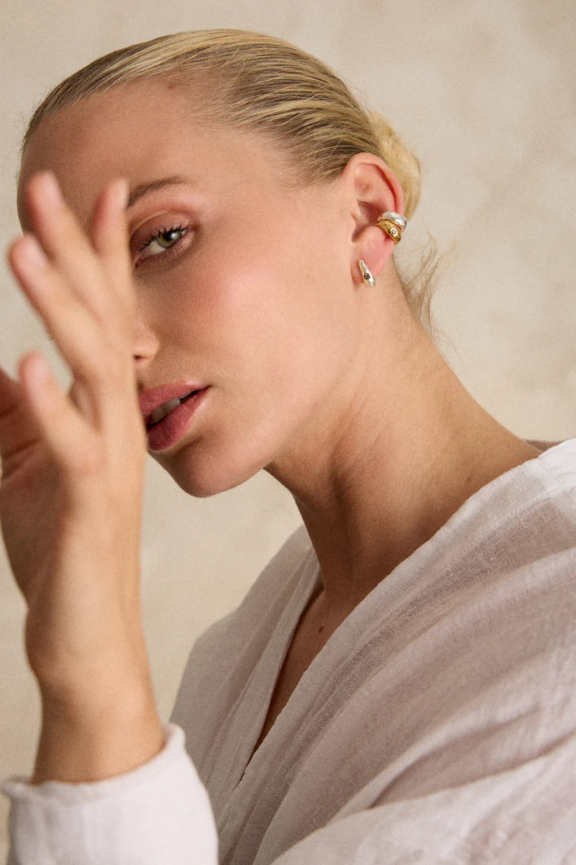 Piezas de latón bañado en plata, adornadas con cristales europeos certificados en sofisticados tonos gris cerúleo y azul. Estos iluminan y mantienen la conexión con el resto de la colección Fuen x Dosprimeras.