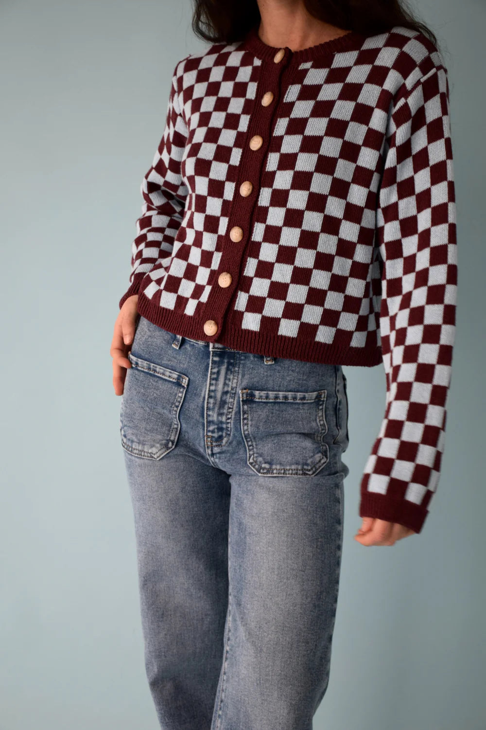 CÁRDIGAN MARTINA BURGUNDY Y CELESTE