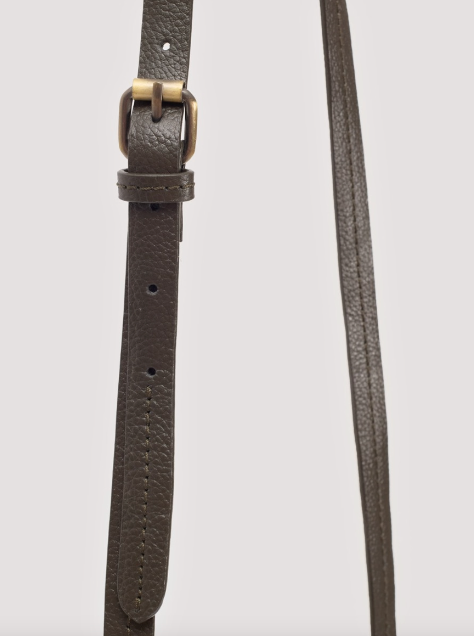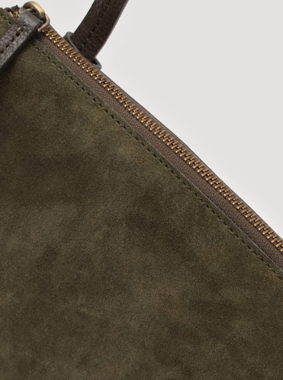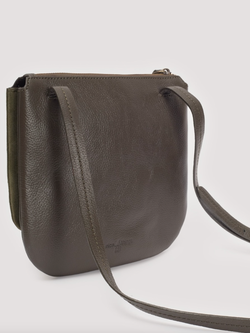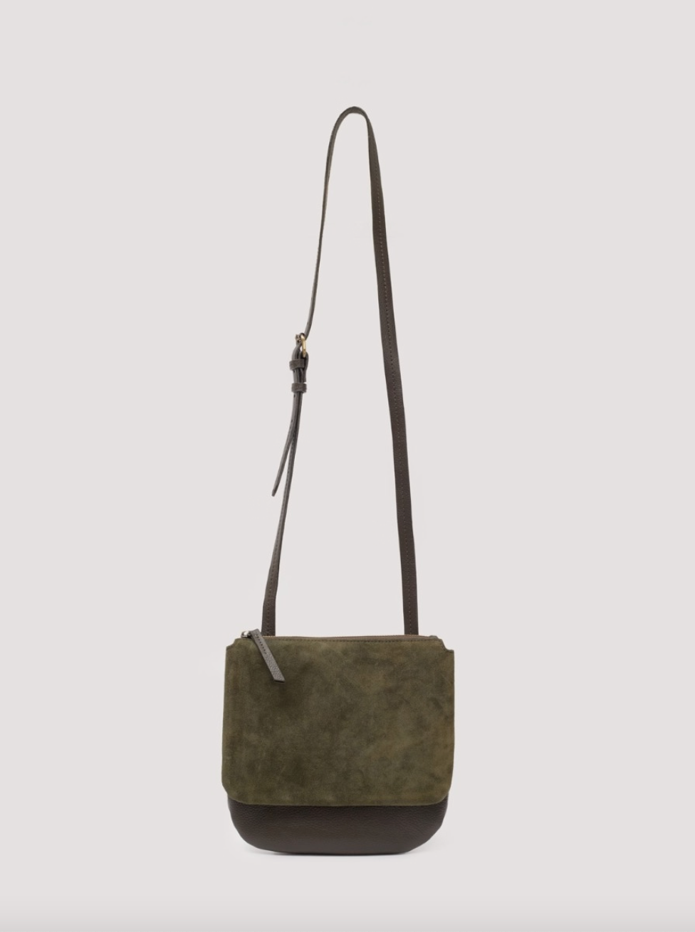 Bandolera de doble compartimento en piel y serraje. Asa regulable. Cierre con cremallera y bolsillo interior. Logo grabado. Medidas: 23 cm largo x 22 cm alto.
