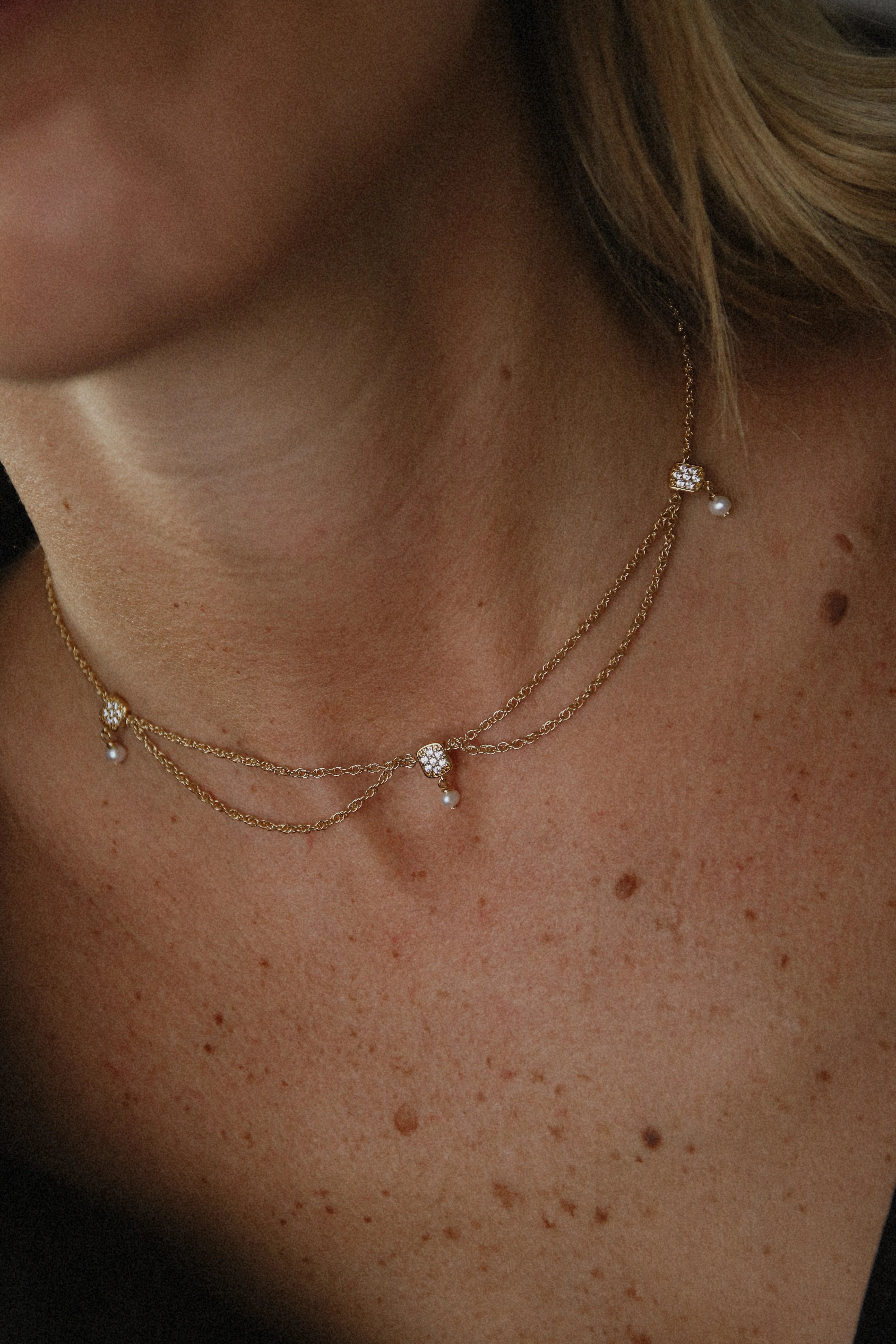 Combina tres motivos con siete circonitas blancas engastadas a mano, y tres perlas naturales suspendida que aporta movimiento y luz. El equilibrio perfecto entre tradición y brillo contemporáneo.