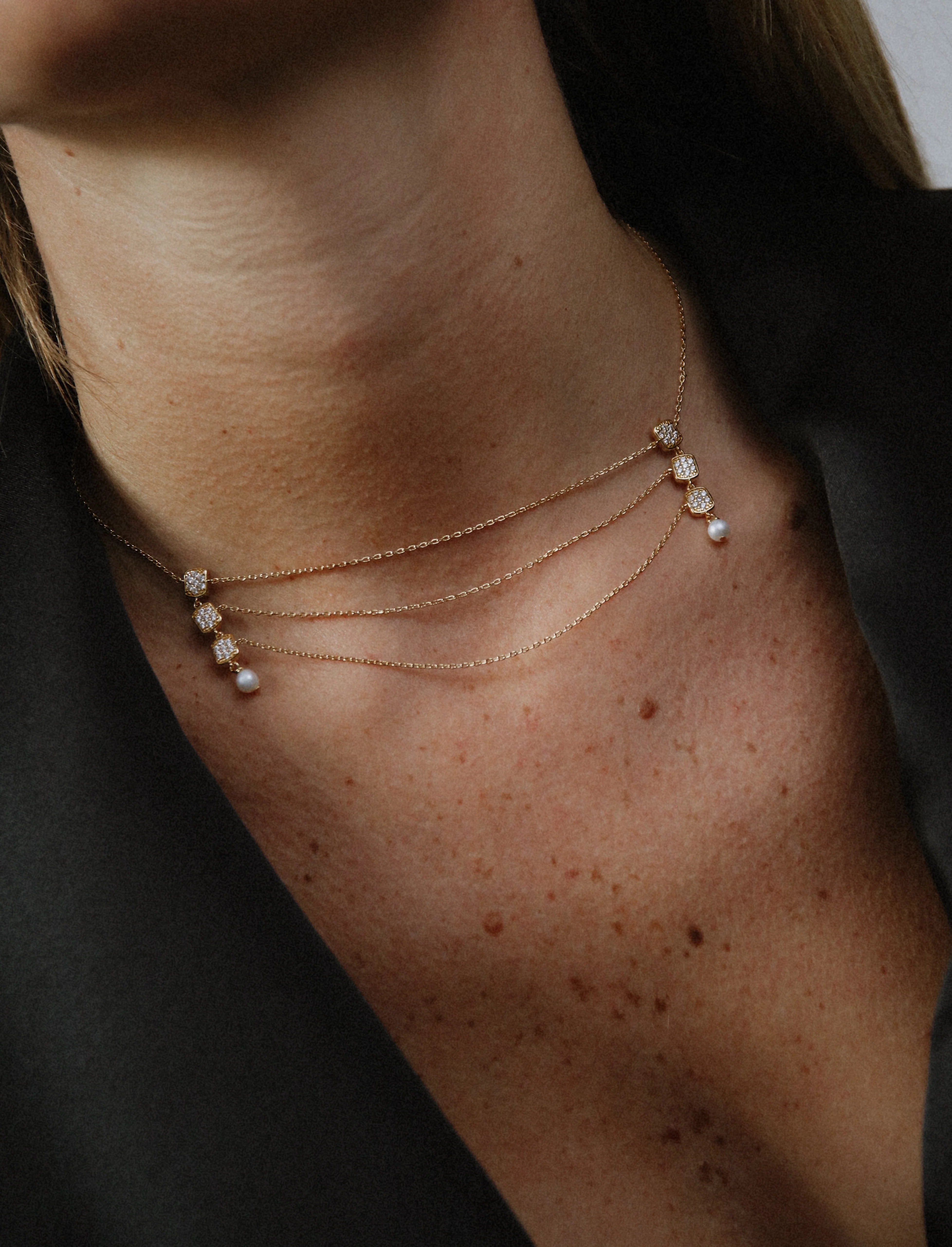 Combina seis motivos con siete circonitas blancas engastadas a mano, y perlas naturales suspendidas que aportan movimiento y luz. El equilibrio perfecto entre tradición y brillo contemporáneo.